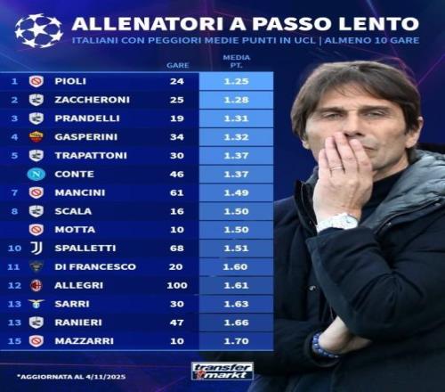 赛后来自德转的统计指出,与意甲赛场的稳定成绩相比,孔蒂在欧冠的带队表现却像是一台失控的机器,他的近30场欧冠比赛仅仅取胜过8场,教练生涯至今他一共带队出战过46场欧冠比赛,总成绩也仅为16胜15平15负,场均只有1.37分,在所有执教至少10场欧冠比赛的意大利教练中排名倒数第五位。