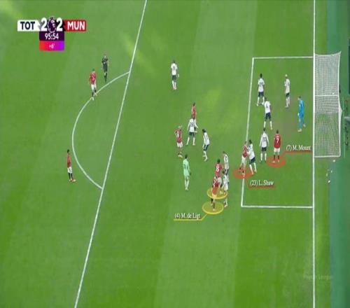 一旦曼联队长开出角球,德利赫特改变方向冲向后点,约罗移向中央区域,芒特则卡在了热刺门将维卡里奥的身前。