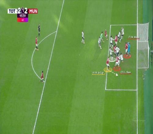 在导致曼联最后时刻扳平比分的那个角球中,热刺采用混合防守体系:马蒂斯-特尔在点球点附近防守短角球选项或任何后插上的球员,奥多贝尔保护小禁区外围空间,小禁区内有五名区域防守球员,三名人盯人防守球员(白色标记)盯防后点。