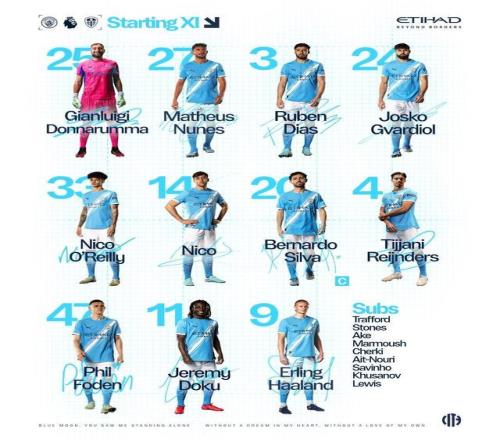 曼城首发:25-多纳鲁马、27-马特乌斯-努内斯、3-鲁本-迪亚斯、24-格瓦迪奥尔、33-尼科-奥赖利、14-尼科-冈萨雷斯、20-伯纳多-席尔瓦、4-赖因德斯、47-福登、11-多库、9-哈兰德