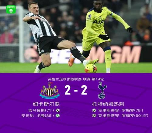 北京时间12月3日英格兰足球顶级联赛 联赛 第14轮,纽卡斯尔联主场对阵托特纳姆热刺。纽卡斯尔联吉马良斯破门,安东尼-戈登破门。托特纳姆热刺克里斯蒂安-罗梅罗梅开二度。最终比分纽卡斯尔联 2-2 热刺。