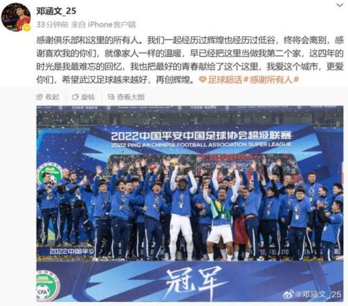 这还不止,据《体育播报》独家消息,邓涵文在合同到期后,他将会告别武汉三镇,新赛季有望加盟云南玉昆,而就在昨天(12月4日),邓涵文在社媒上已经正式与武汉三镇告别,他表示在武汉三镇这四年的时光,是他最难忘的回忆。