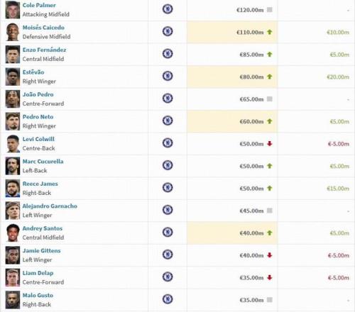 (注:榜单中未列及的球员维持原身价,本期身价没有更新)