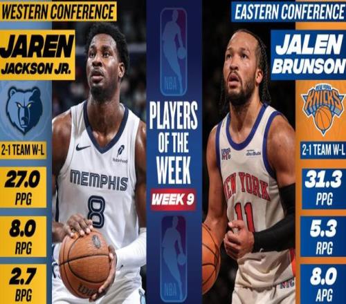 NBA官方公布了第9周的东西部周最佳球员,东部由尼克斯后卫布伦森当选,西部由灰熊中锋JJJ当选。布伦森上周场均砍下31.3分+5.3篮板+8助攻,带领尼克斯队取得2胜1负的战绩。据统计这是布伦森本赛季第2次当选周最佳球员,也是生涯第9次获此殊荣。JJJ上周场均贡献27分+8篮板+2.7盖帽,带领无莫熊队取得2胜1负的战绩。据统计,这是JJJ生涯第2次斩获该奖项。除此之外,康宁汉姆、基迪、克尼佩尔、马克西、怀特、阿夫迪亚、华子、乔治、亚历山大和约基奇等球星获得了周最佳提名。