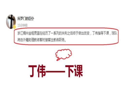 根据篮球媒体人“所罗门的臣仆”透露,浙江队经过了一系列的输球之后,终于是做出了一个决定,那就是丁伟下课。接下来,球队将会由外籍助理教练担任球队主教练之职。由此一来,丁伟就成为了CBA新赛季第三个下课的主教练。