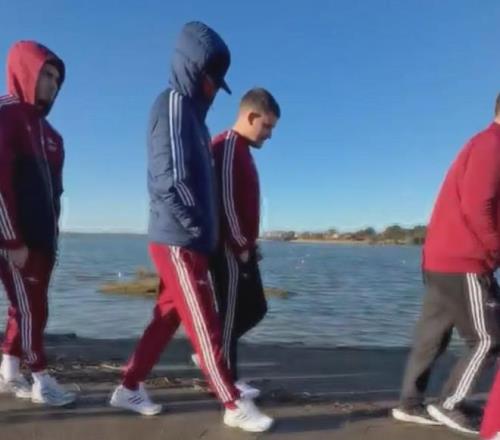 赖斯和阿森纳首席理疗师墨菲跟随全队进行了赛前散步。