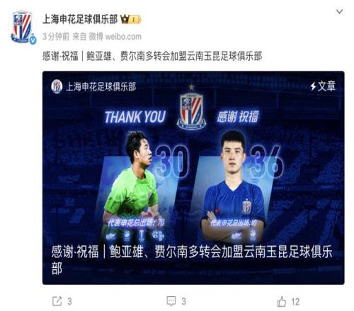 上海申花足球俱乐部发文称:“经友好协商并达成一致,上海申花足球俱乐部球员鲍亚雄、费尔南多转会加盟云南玉昆足球俱乐部。”