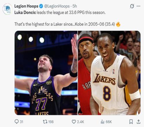 6.东契奇场均33.6分是05-06赛季湖人队史后最高。